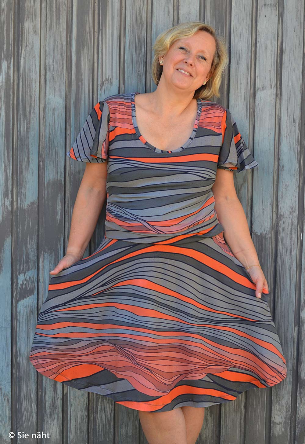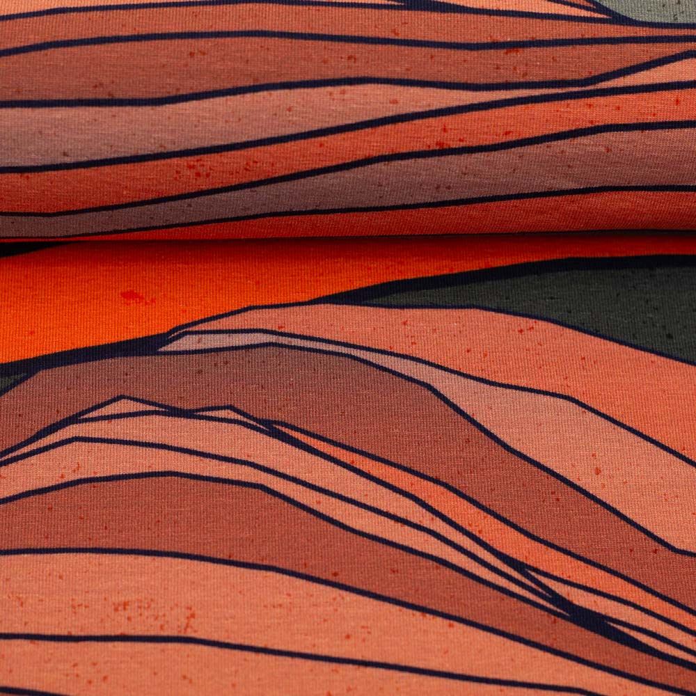 Kombistoff zum Panel In the Dunes von Thorsten Berger - Jersey mit grauen und orangefarbenen unregelmäßigen Streifen, die die Dünenlandschaften nachbilden.
