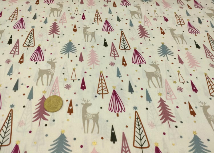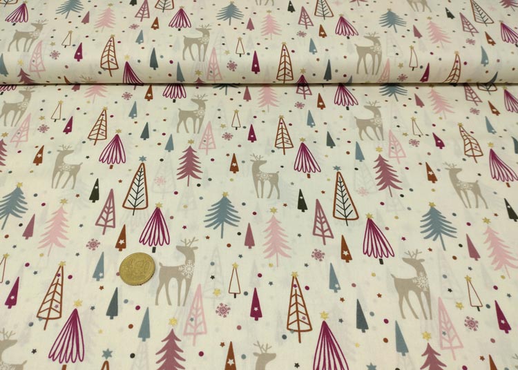 Bedruckter Baumwollstoff Webware, ein Weihnachtsstoff mit pastellfarbenen Bäumen und Rehe. Der pinke Baum ist inkl. Stern und Stamm 4,8 cm hoch