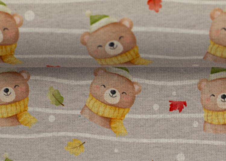 Alphen fleece double-faced with cuddly bears – cosy and warm, with a mottled grey reverse side. Perfect for hoodies, jackets and winter clothing.