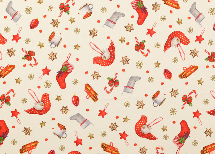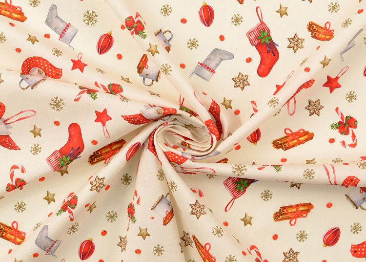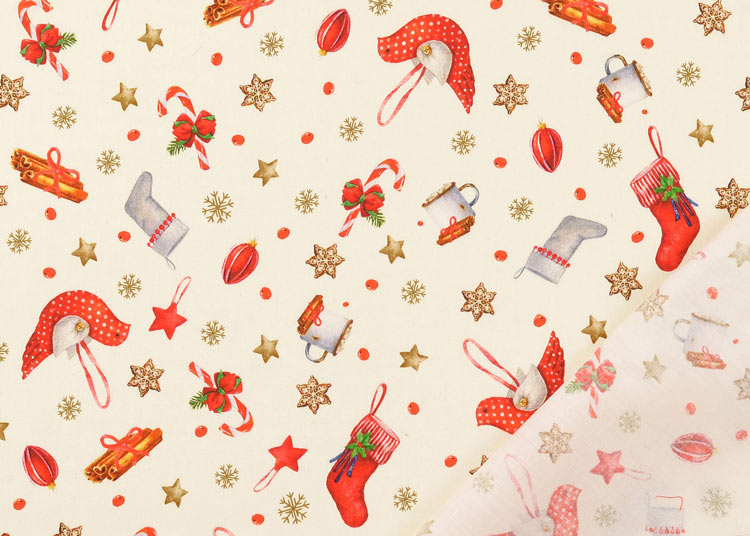 Dieser festliche Baumwollstoff in feiner Popeline-Qualität bringt sofort Weihnachtsfreude auf deinen Nähtisch. Auf dem zarten Naturweiss wirken die verschiedenen Weihnachtsmotive, wie Zimtstangen, Zuckerstangen, Stiefel, Vögelchen, Weihnachtskugeln, Sterne und Schneeflockenstrahlen besonders weihnachtlich. Das harmonische Farbspiel sorgt für einen klassischen, aber zugleich frischen Weihnachtslook.